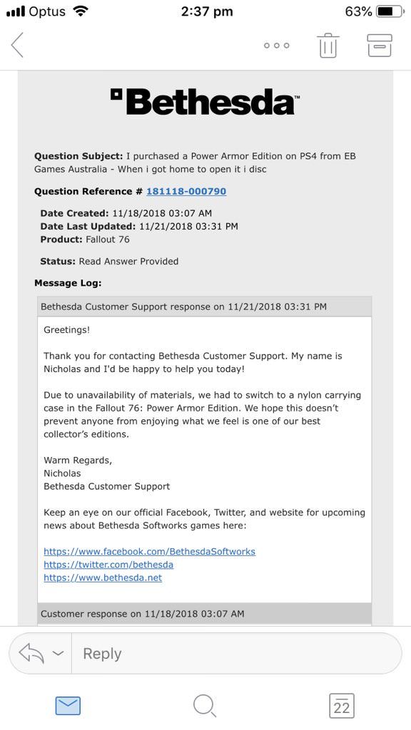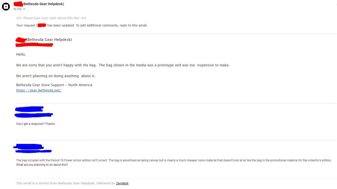Bethesda jedynie przeprosiła zdenerwowanych klientów, wyrażając nadzieję, że gorsza jakość torby nie wpłynie negatywnie na radość, jaką będą czerpali z kolekcjonerki. Wytłumaczono, że koszty płóciennej wersji okazały się zbyt wysokie, więc zdecydowano się na zmianę. Furia graczy zmusiła jednak firmę do wyrażenia większej skruchy i w ramach rekompensaty oferuje ona teraz 500 atomów do wydania w grze. Taką sumę tej wirtualnej waluty można kupić za 5 dolarów, więc wątpimy, aby satysfakcjonowało to większość nabywców Edycji Power Armor. Zwłaszcza, że za 500 atomów można kupić w