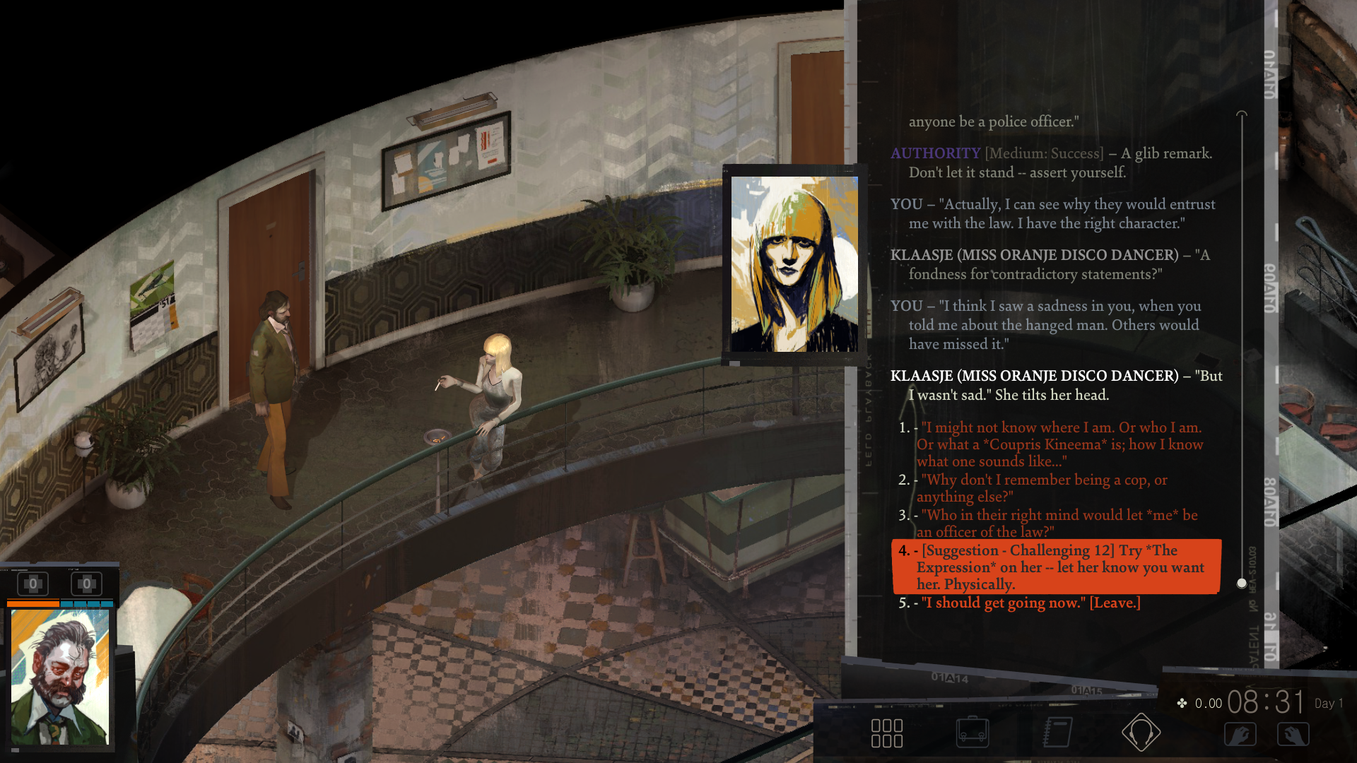 Naszym orężem zaÅ› jest jÄ™zyk – w Disco Elysium nie mamy bowiem do czynienia z typowymi dla gatunku walkami, ani jednÄ…! Owszem, od czasu do czasu znajdziemy siÄ™ w niebezpiecznej sytuacji, na które możemy zareagować w rożny sposób (zawsze jednak dysponujÄ…c możliwoÅ›ciÄ… przemyÅ›lenia tego posuniÄ™cia, a w miÄ™dzyczasie zrobienia sobie herbaty, obejrzenia odcinka ulubionego serialu, pokontemplowania nad jestestwem wszechÅ›wiata itp. itd.), starcie jednak przebiega w opisowy sposób i po części jest uzależnione od współczynników, którymi w danym momencie dysponujemy, ale też i zgodnie z kanonami gatunku wynikiem rzutu kośćmi.
