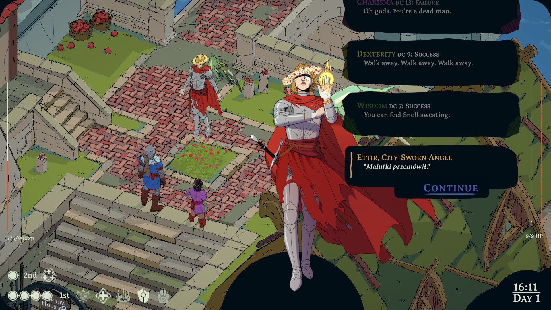 Wspomniany system upływu czasu wisi nad graczem przez całą rozgrywkę. W teorii mamy ledwie kilka dni na rozwiązanie powierzonego nam śledztwa. Czasu jest dość sporo, zwłaszcza, że nie upływa on bez ustanku – w czasie konwersacji na przykład czas posuwa się naprzód tylko przy aktywnym wybieraniu opcji dialogowych, zwłaszcza tych opatrzonych rzutami. Nie mamy ustalonej z góry ścieżki tego jak mamy postępować – możemy zrobić cokolwiek. Nawet kompletnie zignorować nasze zadanie na rzecz bicia się z wielkimi mewami, czy też pomocy w agitacji wyborczej. Do tego pewne miejsca i wydarzenia mają miejsce tylko w określonych porach dnia. Przykładowo – zajmując się zbieraniem zadań, kompletnie spóźniłam się na spotkanie z lokalnym zarządcą, przez co dopiero później dowiedziałam się, że na czas śledztwa udostępniono mi miejsce do odpoczynku w starej wieży. Nie żeby był to jakiś problem, po prostu mój Kleryk tej nocy trwał na nogach o samej sile woli i miłości do jedzenia jabłek (nie pytajcie).