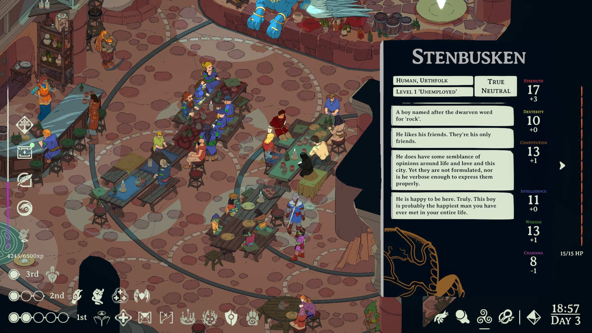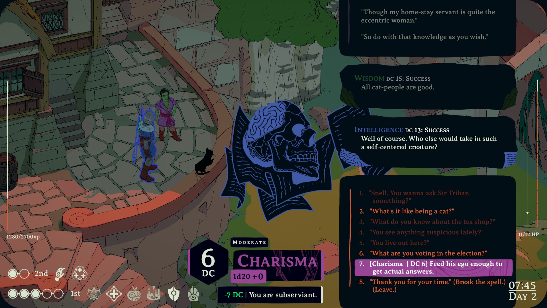 Disco Elysium, każda cecha – siła, kondycja, zręczność, inteligencja, mądrość i charyzma – są tutaj wręcz własnymi postaciami, chcącymi przekonać nas do swoich racji, komentującymi też nasze poczynania na bieżąco.